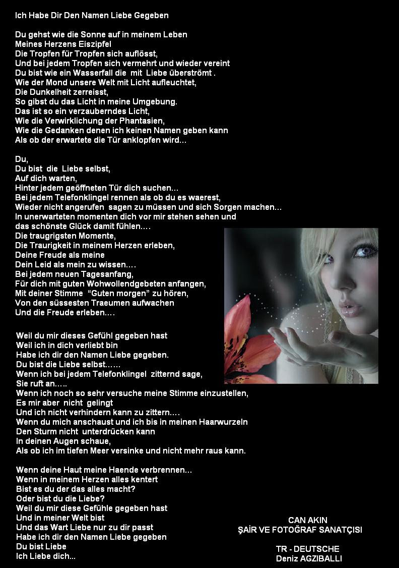 Weil du mir dieses Gefühl gegeben hast Weil ich in dich verliebt bin Habe ich dir den Namen Liebe gegeben. Du bist die Liebe selbst…… Wenn ich bei jedem Telefonklingel zitternd sage, Sie ruft an….. Wenn ich noch so sehr versuche meine Stimme einzustellen, Es mir aber nicht gelingt Und ich nicht verhindern kann zu zittern…. Wenn du mich anschaust und ich bis in meinen Haarwurzeln Den Sturm nicht unterdrücken kann In deinen Augen schaue, Als ob ich im tiefen Meer versinke und nicht mehr raus kann.